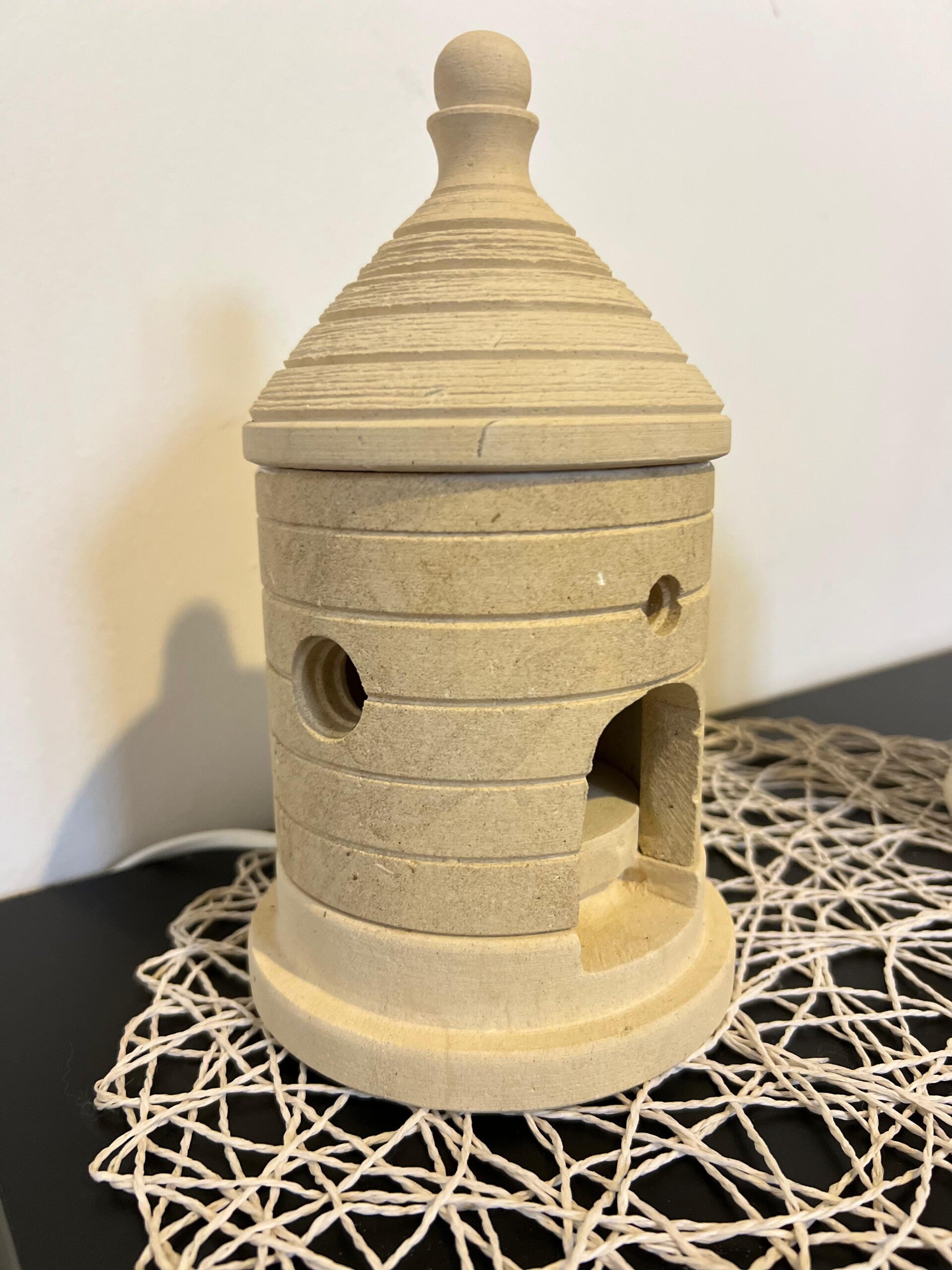 Realizzata a mano dai maestri artigiani salentini, questa lampada a forma di trullo è scolpita in pregiata pietra leccese, una delle pietre più iconiche e caratteristiche del territorio.